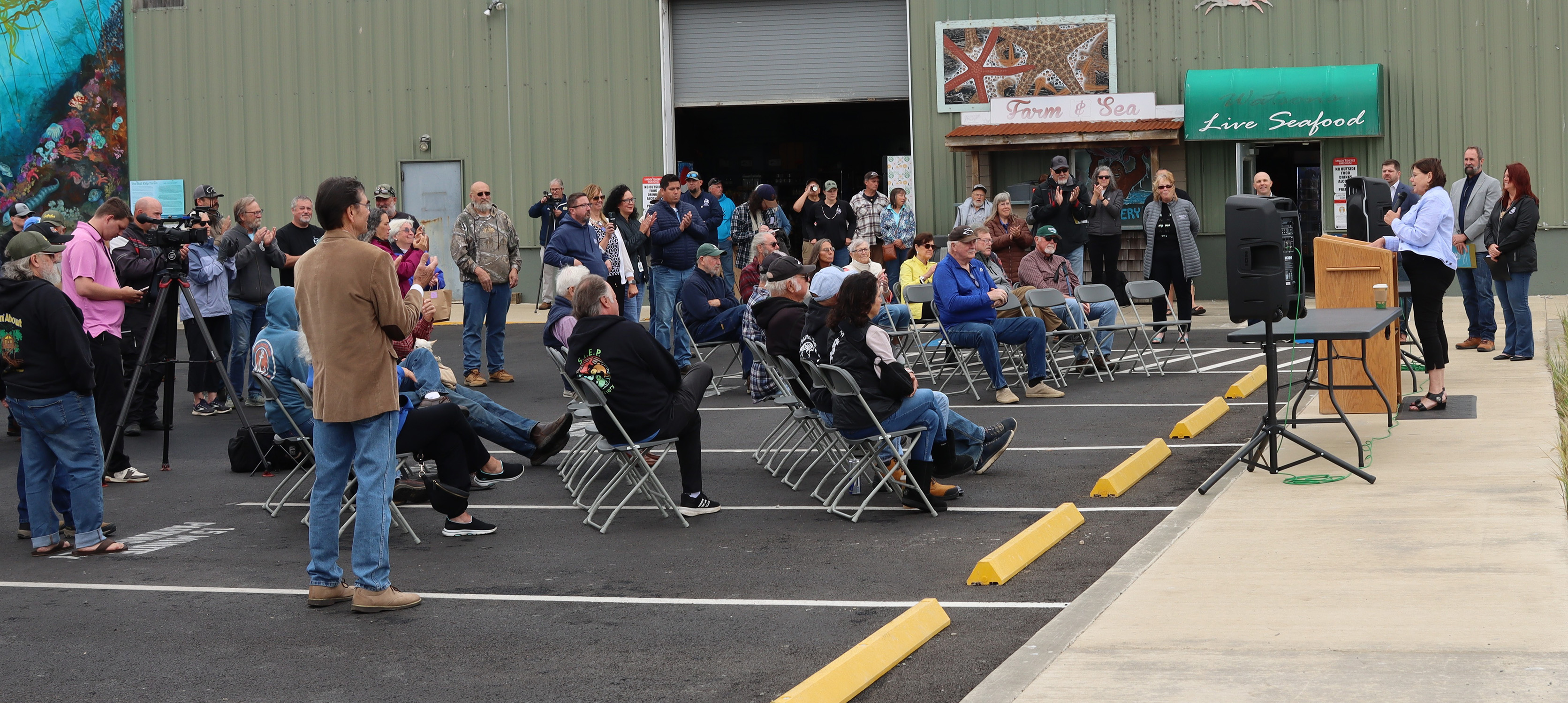 ODFW Director Debbie Colbert (at podium) and Coquille Tribe Chairwoman Brenda Meade (to the right in black jacket) on July 31, 2025 in Bandon, Ore. to announce a major step forward in their combined management effort on salmon recovery in the Coquille River. The first fall Chinook fishery since 2021 will be proposed for the Coquille River following the efforts of the Coquille Tribe, ODFW staff and STEP (Salmon Trout Enhancement Program) volunteers to improve the performance of the hatchery program.