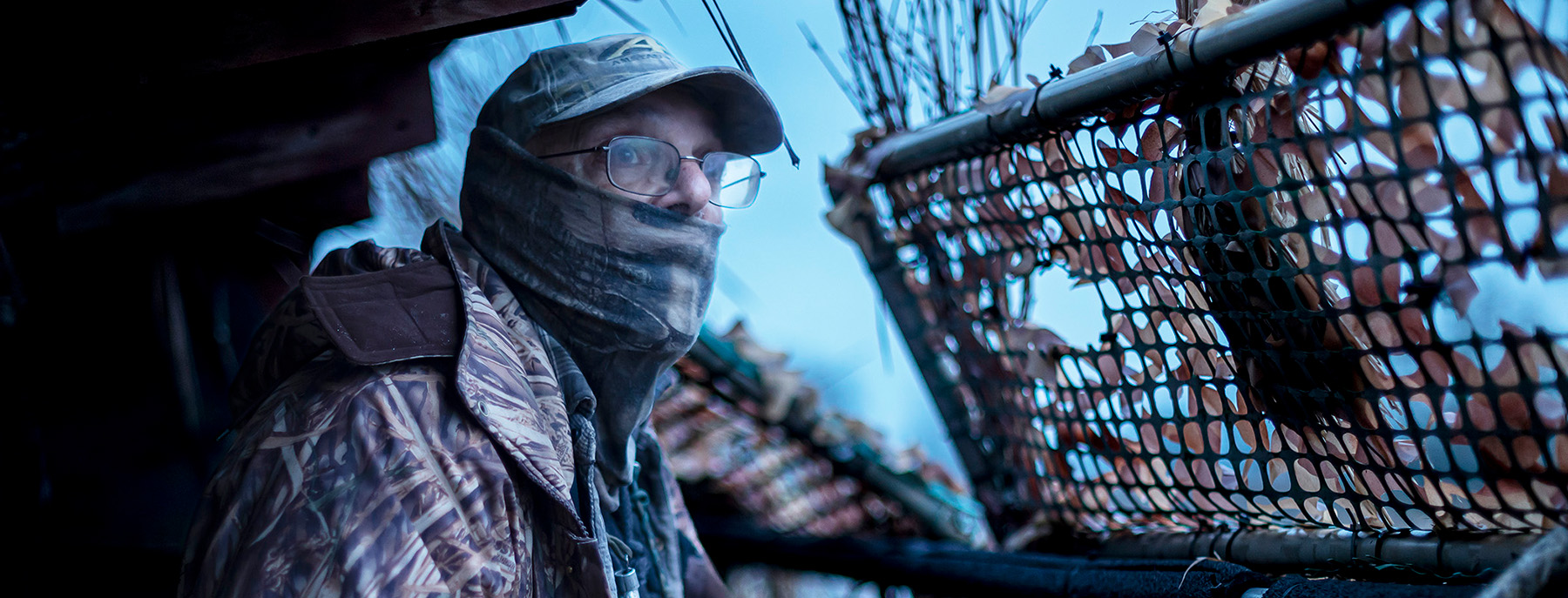 ODFW photo: A waterfowl hunter waits patiently in a blind, scanning for ducks.