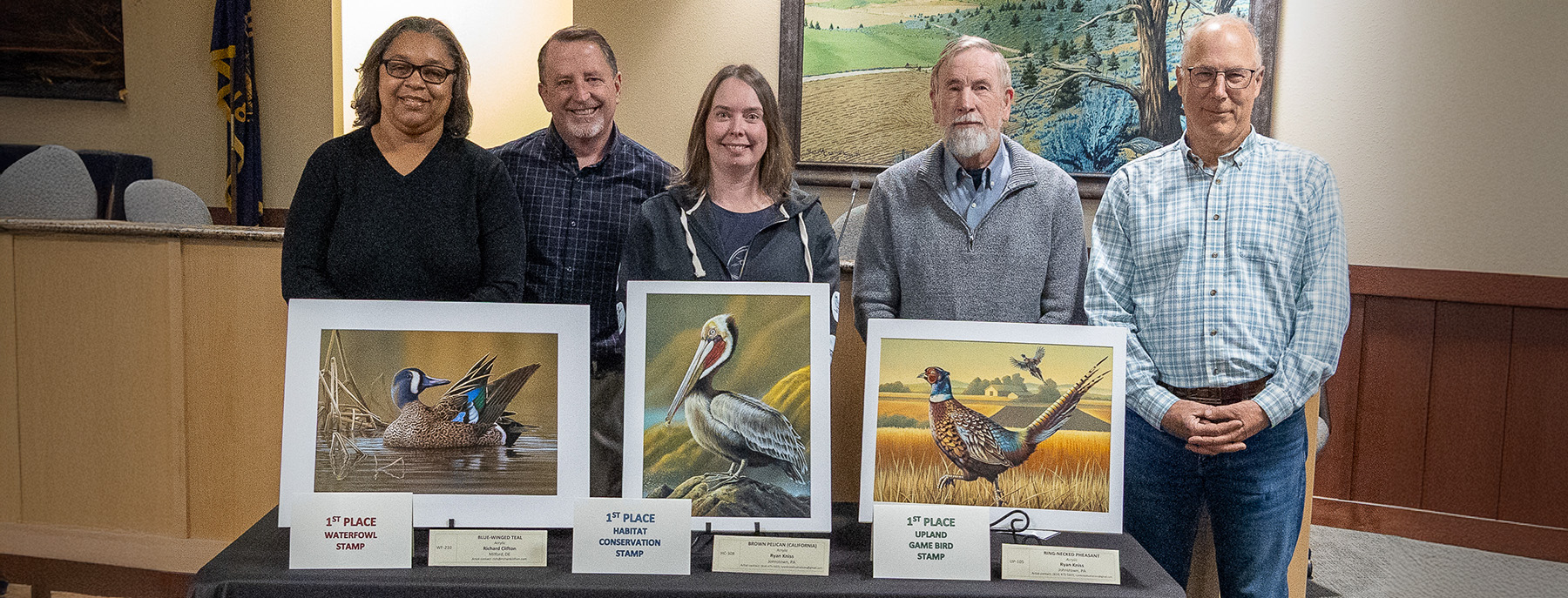 Header photo: Stamp art contest judges pose with the winning entries at ODFW Headquarters in Salem on Nov. 4.